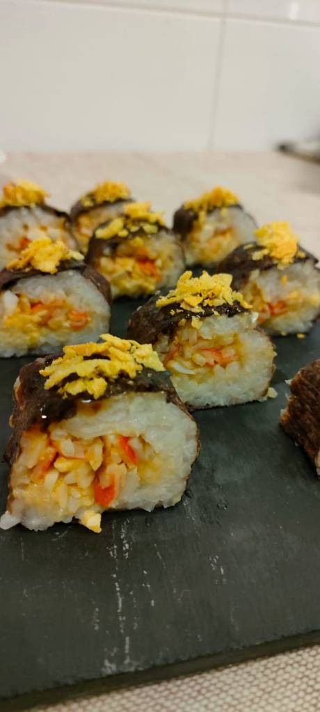 Para elaborar el sushi estiramos el arroz sobre el alga (dejando márgenes para poder hacer el rulo). Después añadimos al gusto: el aguacate, el cangrejo y el huevo. Hacemos el rulo apretando bien para que quede bien compacto. Para cerrar el alga y evitar que se pegue el arroz es bueno tener los dedos bien mojados en agua.